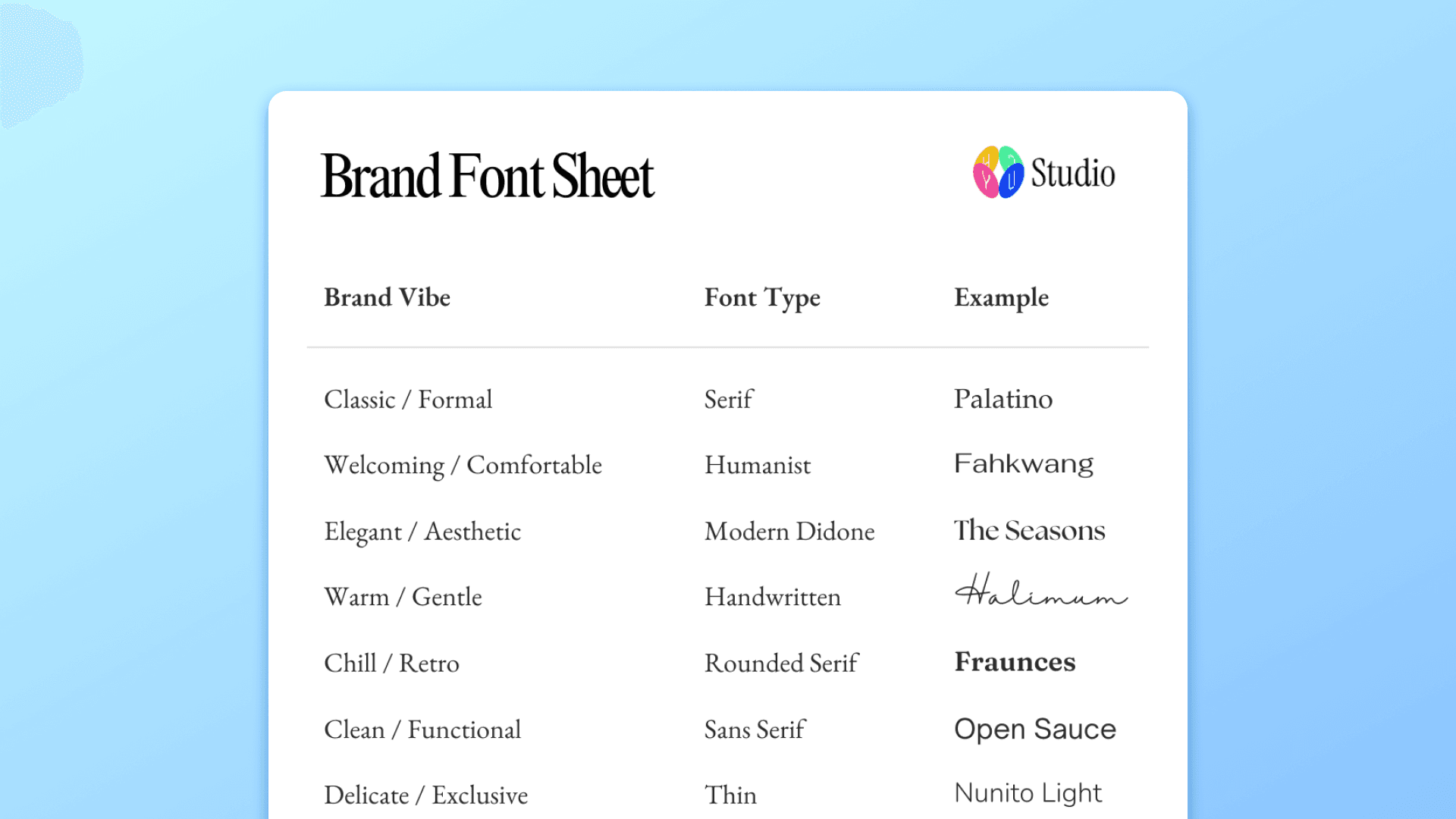 This is a simple sheet that might help you find the right font type for you brand.
